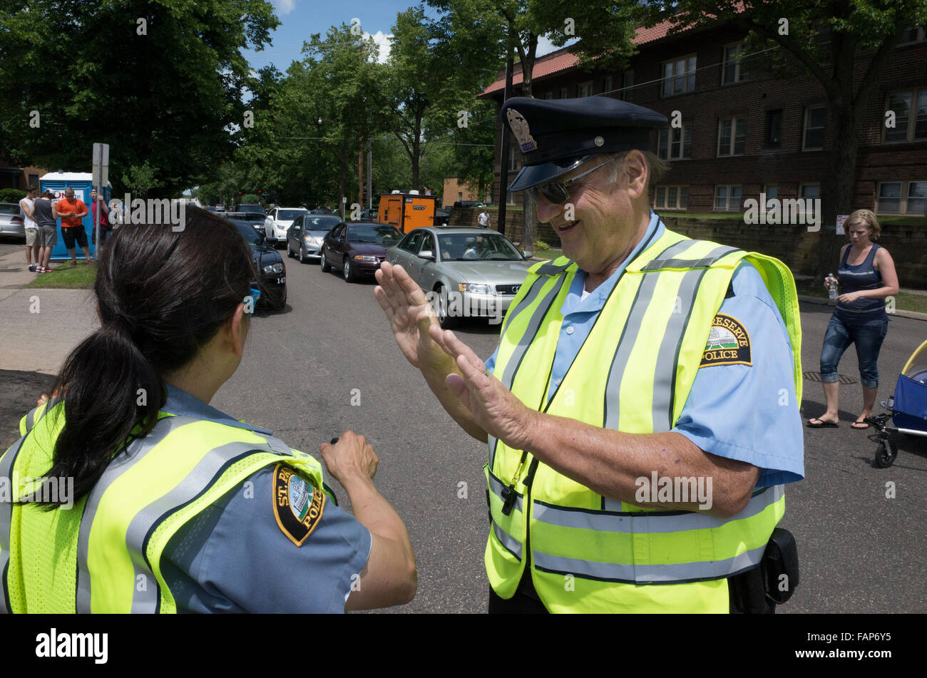 Senior Reserve Policeman Demonstrating Hand Signals To Asian Stock
