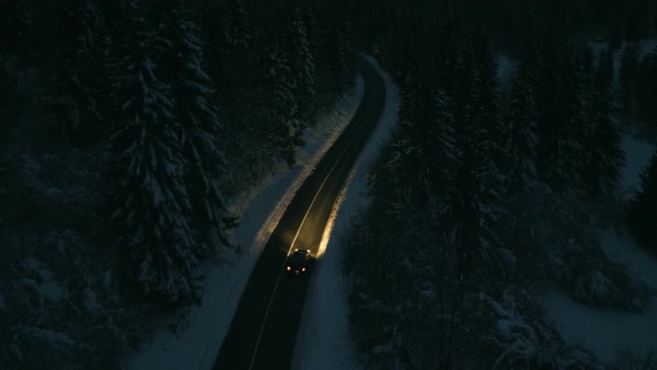 Aerial Shot Of Cars Driving Through A Snowy Forest At Night
