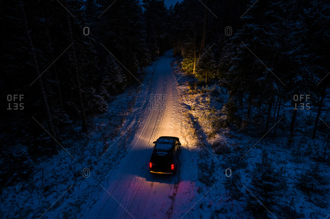 Aerial View Of A Car Driving By Night On The Snowy Road In The